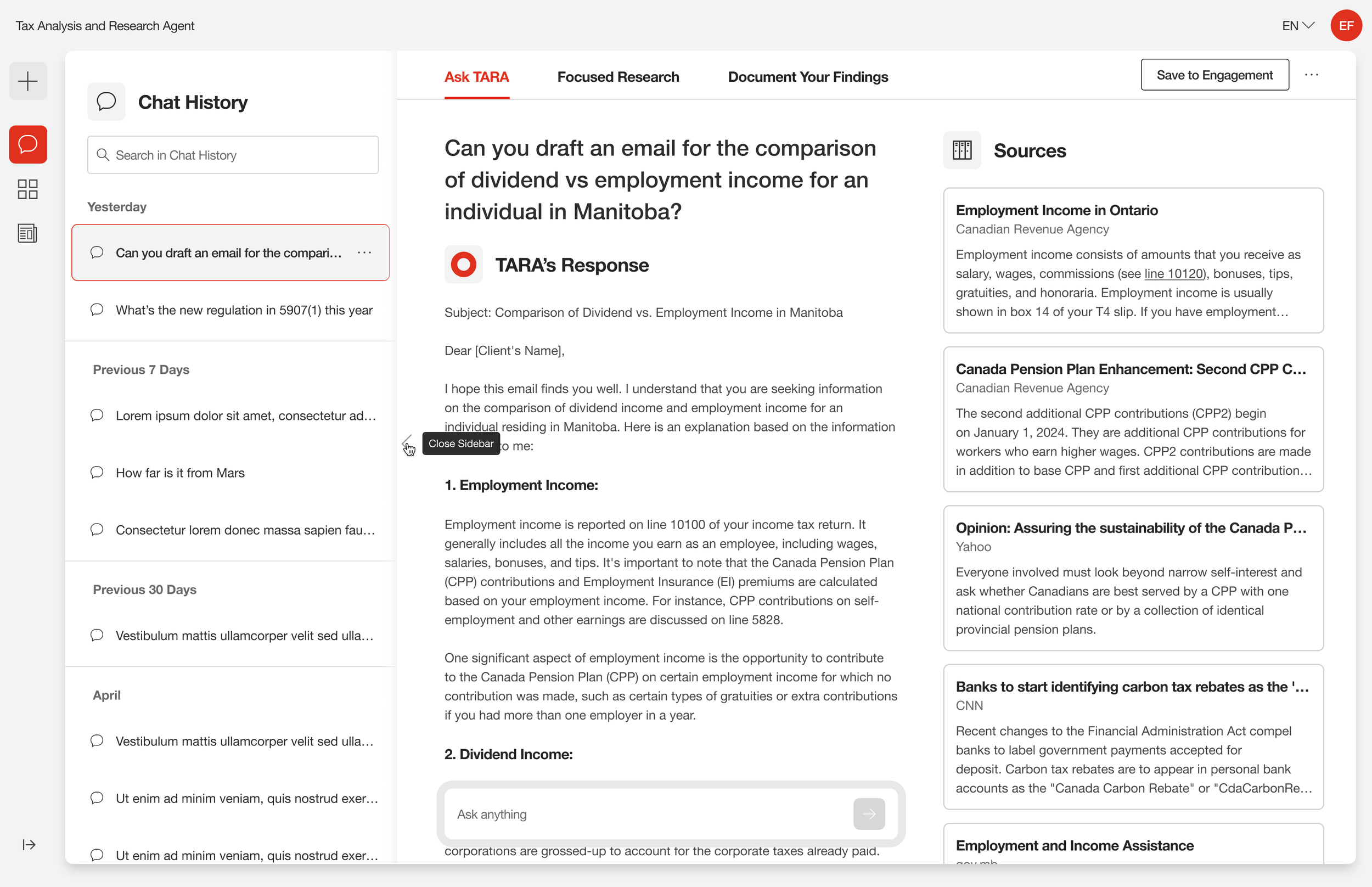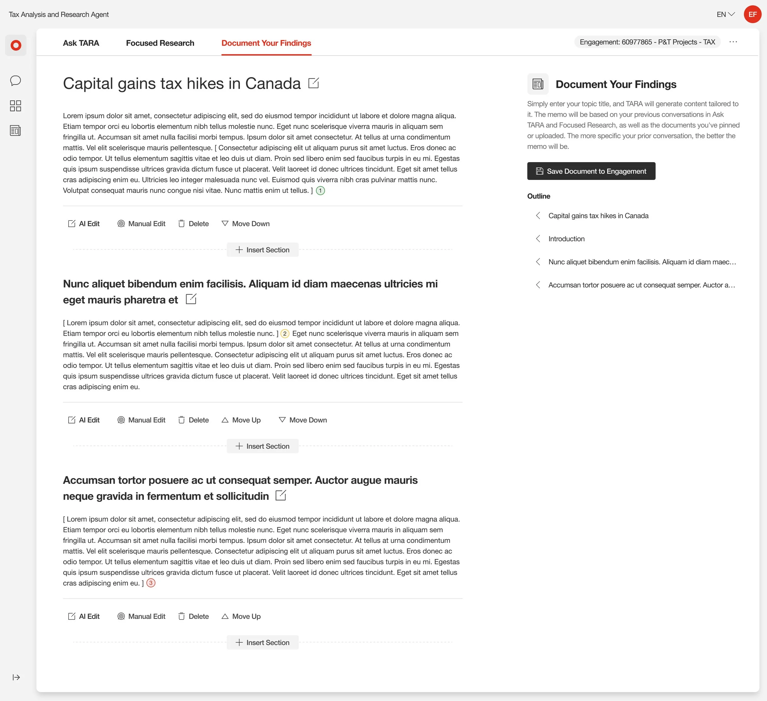 Tax practitioners spend too much time and money on research, often sifting through irrelevant materials. To address this, we designed TARA, a GenAI-powered tool that streamlines tax research using trusted sources like the Income Tax Act, CRA documents, and court cases.